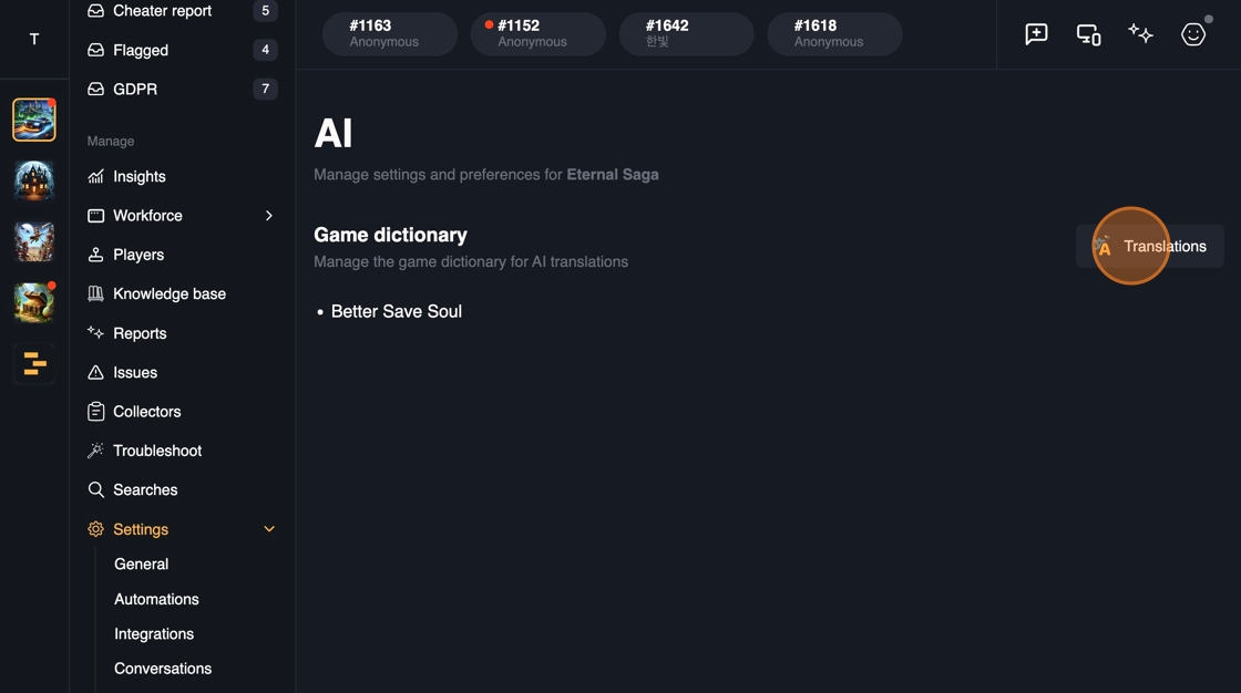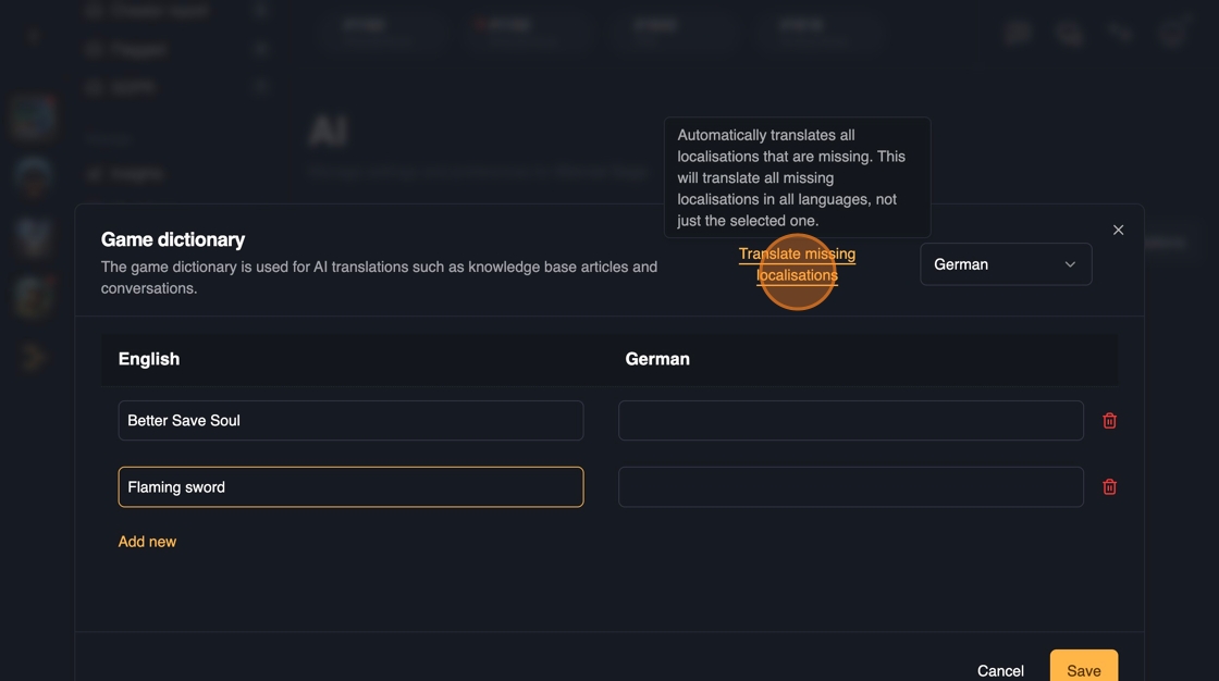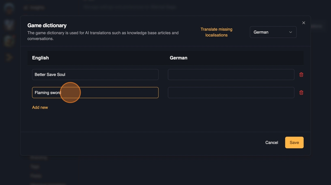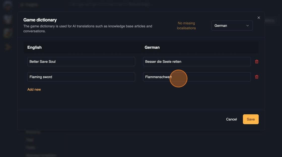 The glossary / dictionary of Theymes is very powerful tool to make sure specific words are translated correctly in different languages. You can have a total control on how the words will translate. Glossary is automatically used by the collectors, troubleshooting, multilingual tickets and the knowledge base, whenever you make automated translations.