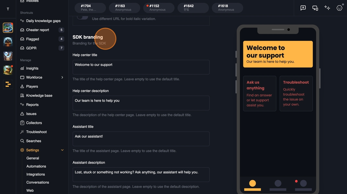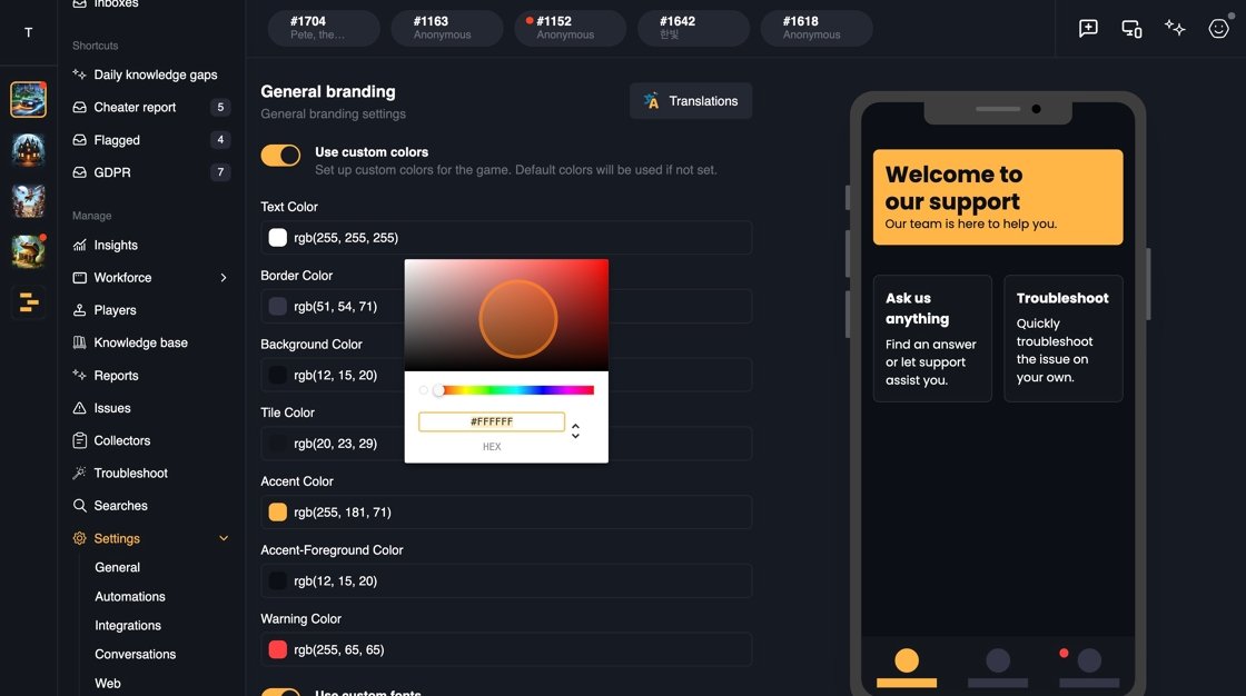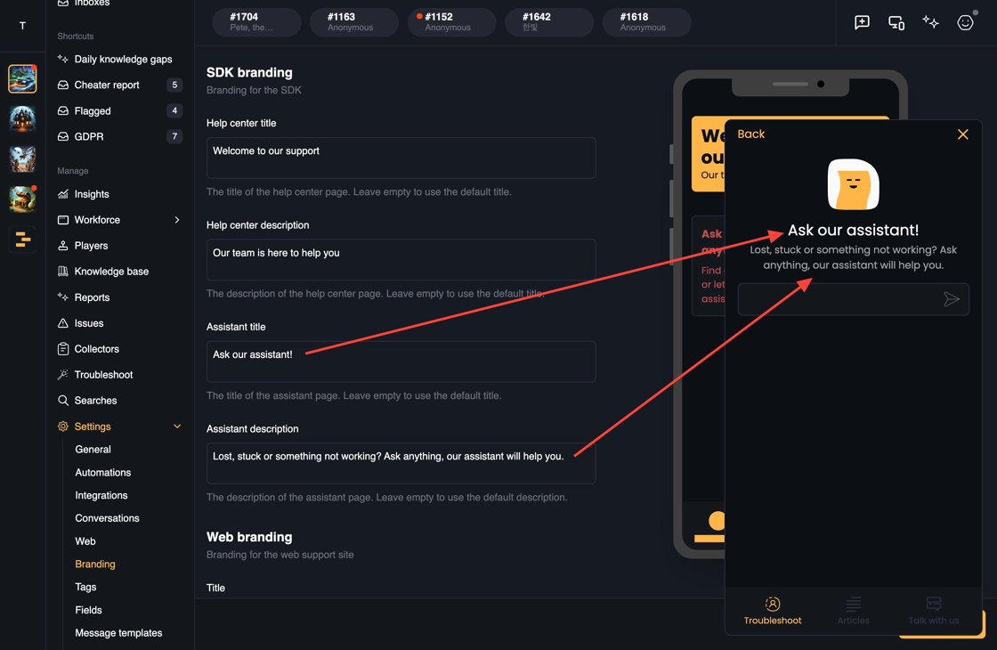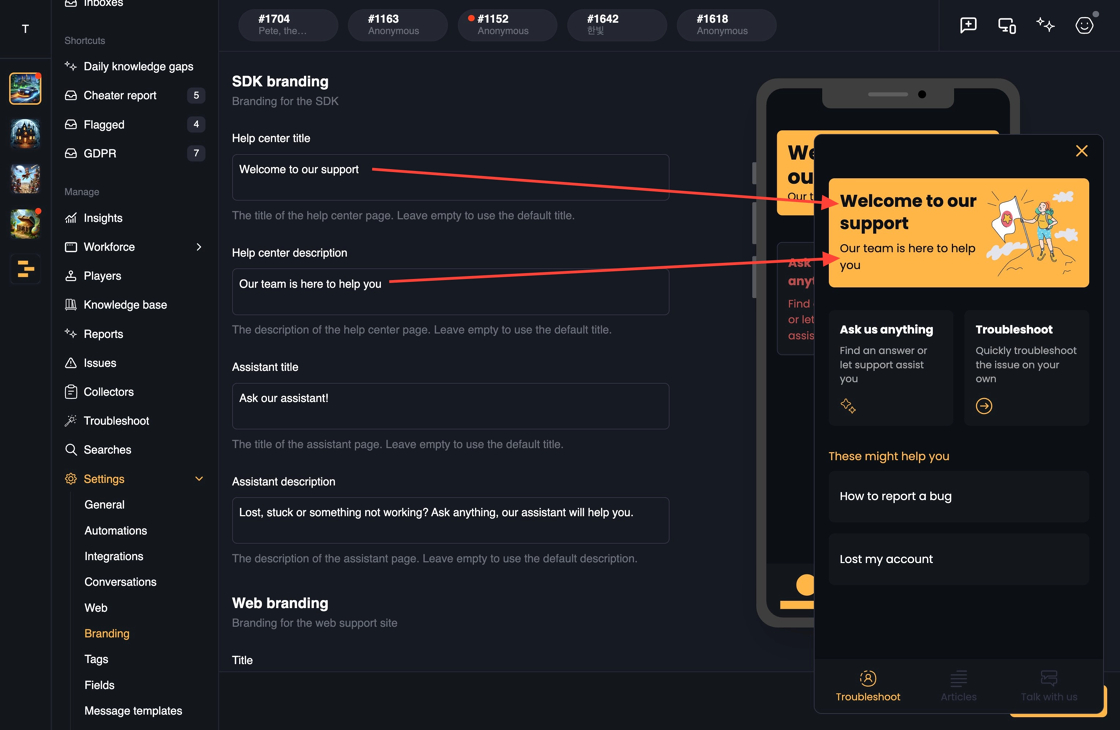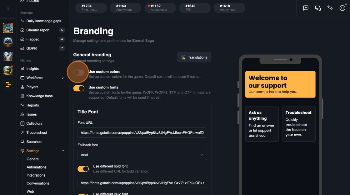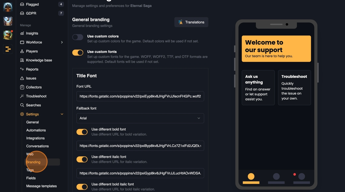 1. To modify the branding / theme of the in-game SDK and Web channel, navigate to the Settings > Branding, which will show you a lot of options to modify the style, text, fonts.