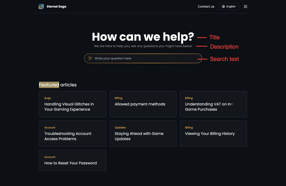 6. To change the in-game help center landing view text, modify the 'Help center title' and 'Help center description'.