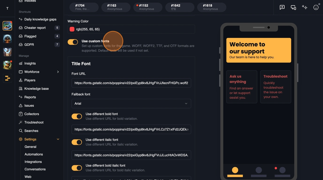 4. To set custom fonts, you can check the 'Use custom fonts'. After enabling this, you can set custom fonts for Titles and body text. These changes will take effect on the in-game SDK and the Web channel.