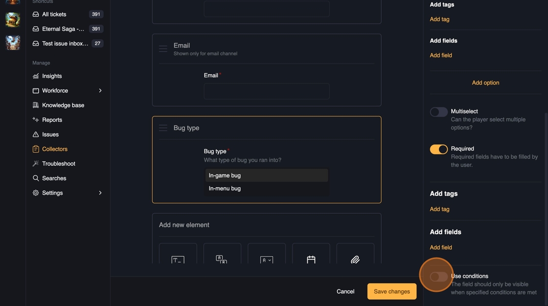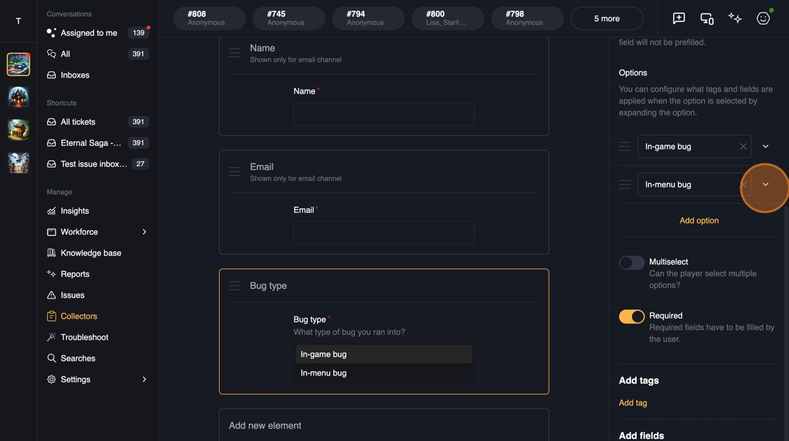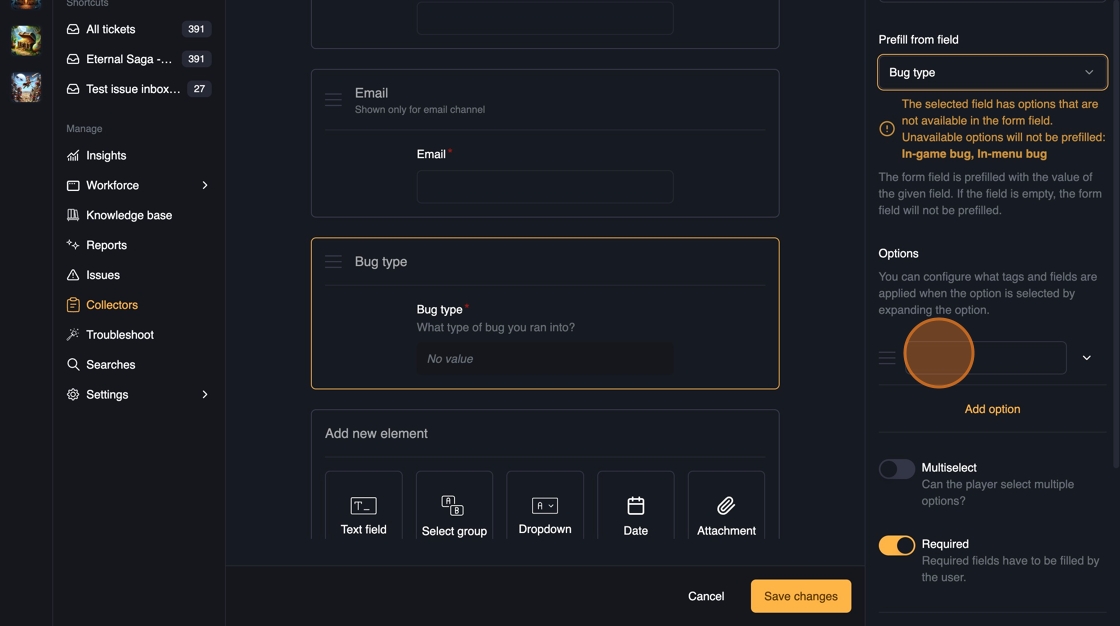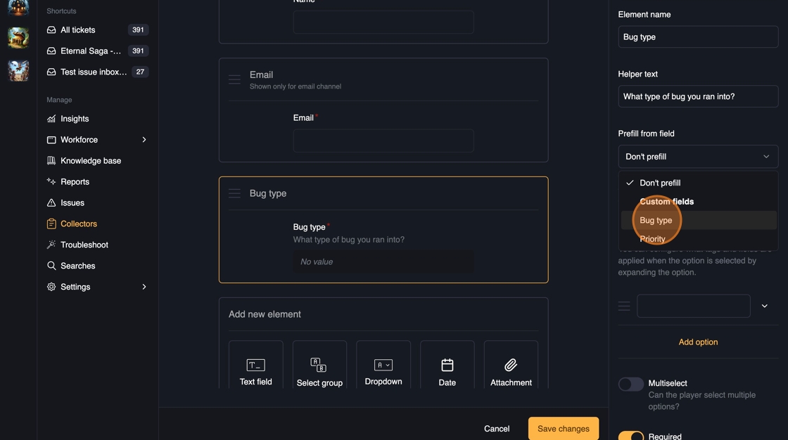 You can choose to prefill the element using a field if wanted. For example, if you set the field in-game before the user opens the help center, you can prefill the collector element to streamline the experience and reduce the risk of user errors.