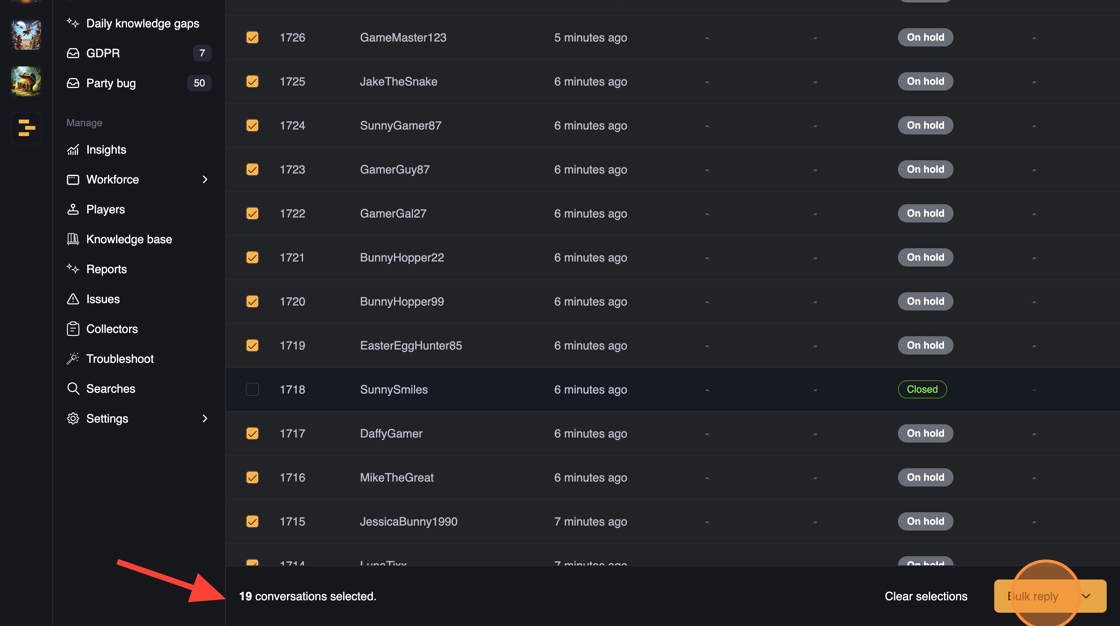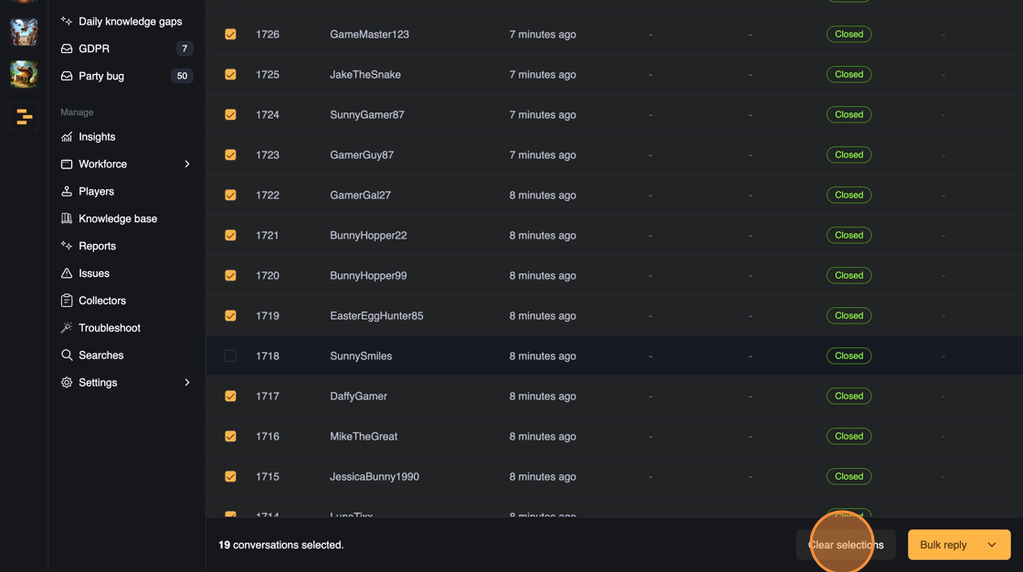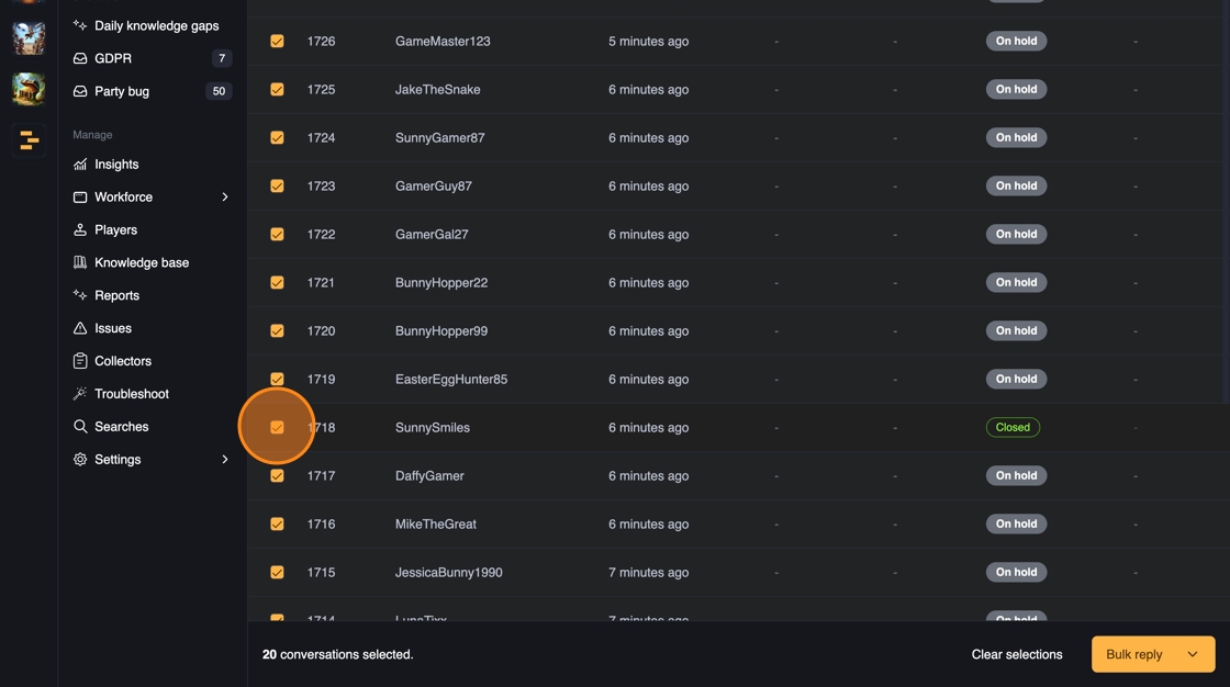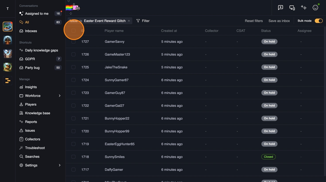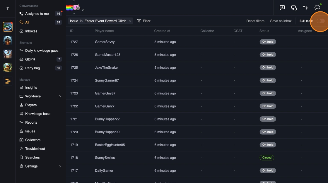Tip. You can also shift+click tickets to add them to bulk selections without enabling bulk mode explicitly.