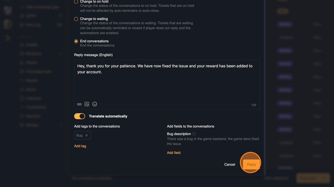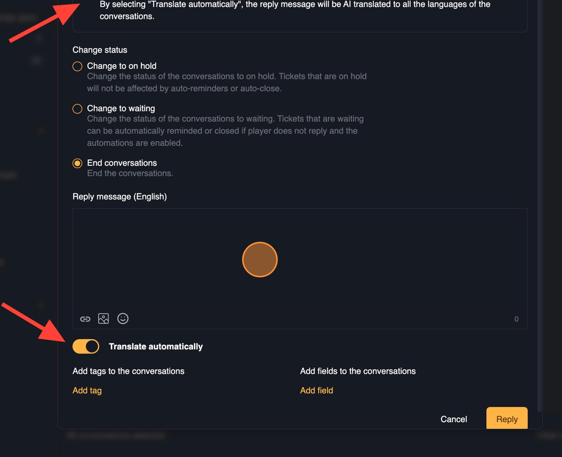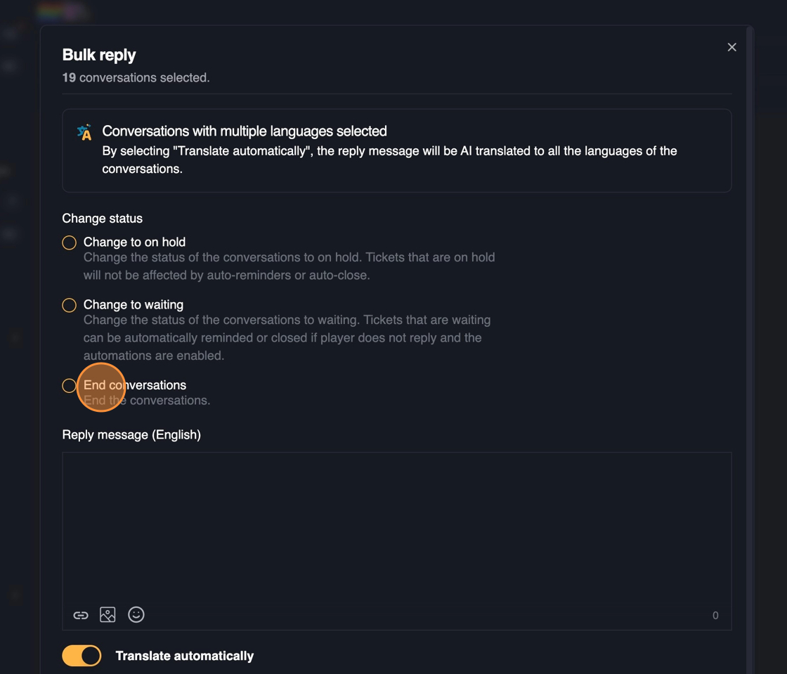 Write your message in the "Reply message (English)" field. If you selected tickets in multiple languages, Theymes will automatically translate the message to all the selected languages for you. In case you want to translate the message manually, you can click on the "Translate automatically" toggle.