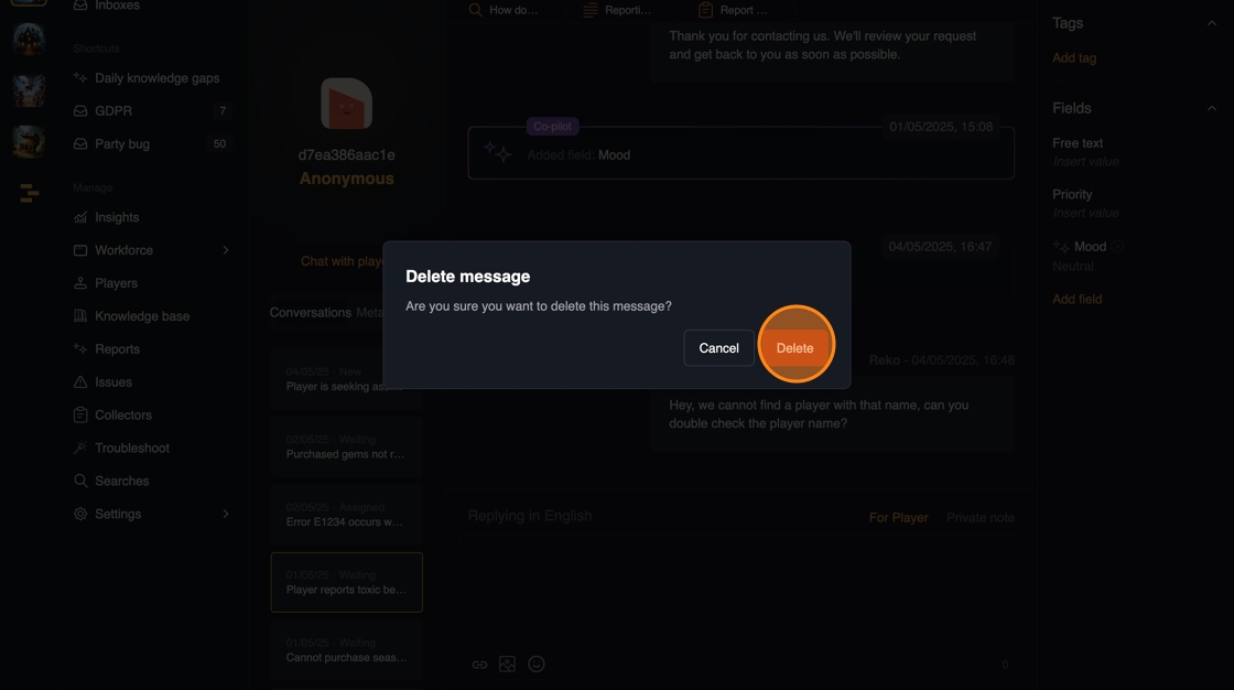 A confirmation will pop up. Click "Delete" to confirm you want to delete your message.