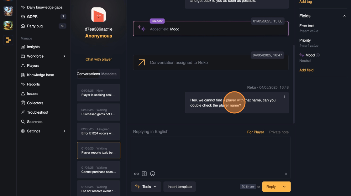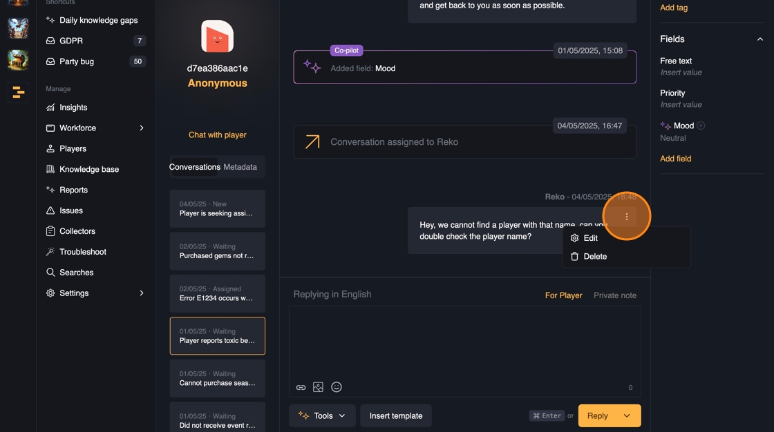 You can delete your messages, but only if the player has not yet seen the message. To delete a message, first hover the message you want to edit with your mouse. A triple dot "..." icon will appear at the top right of the message.