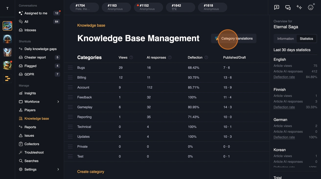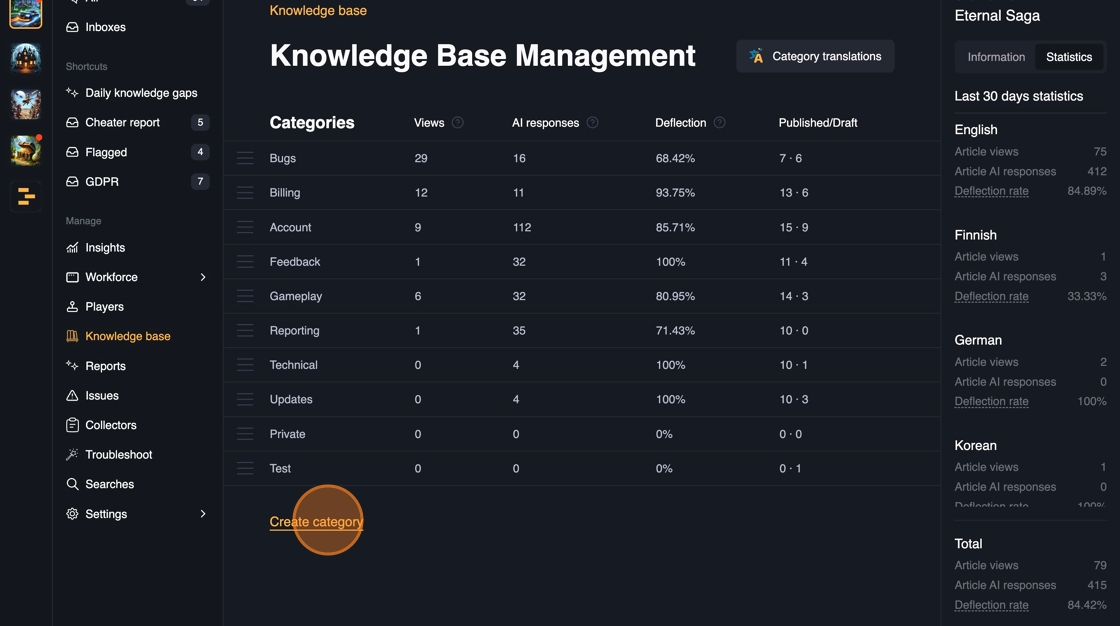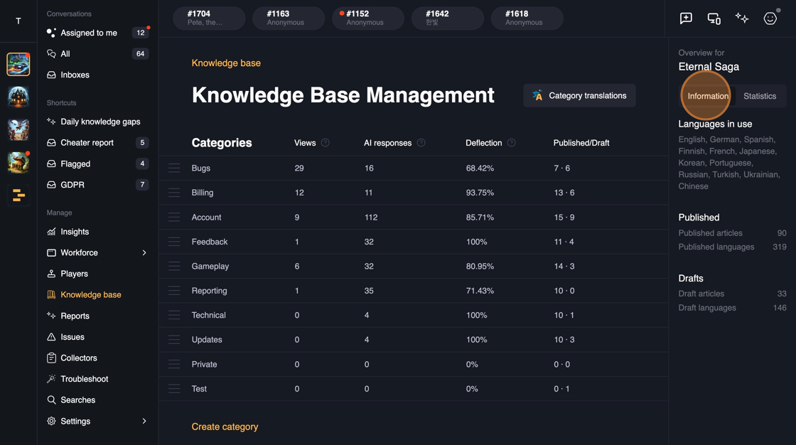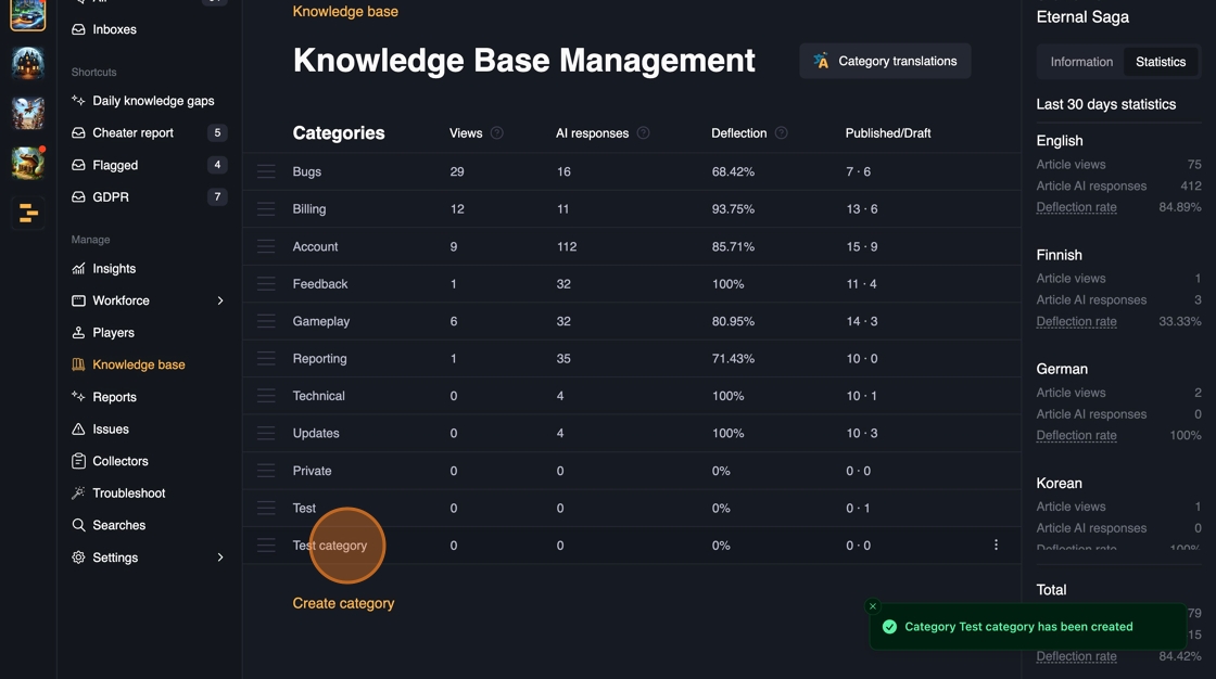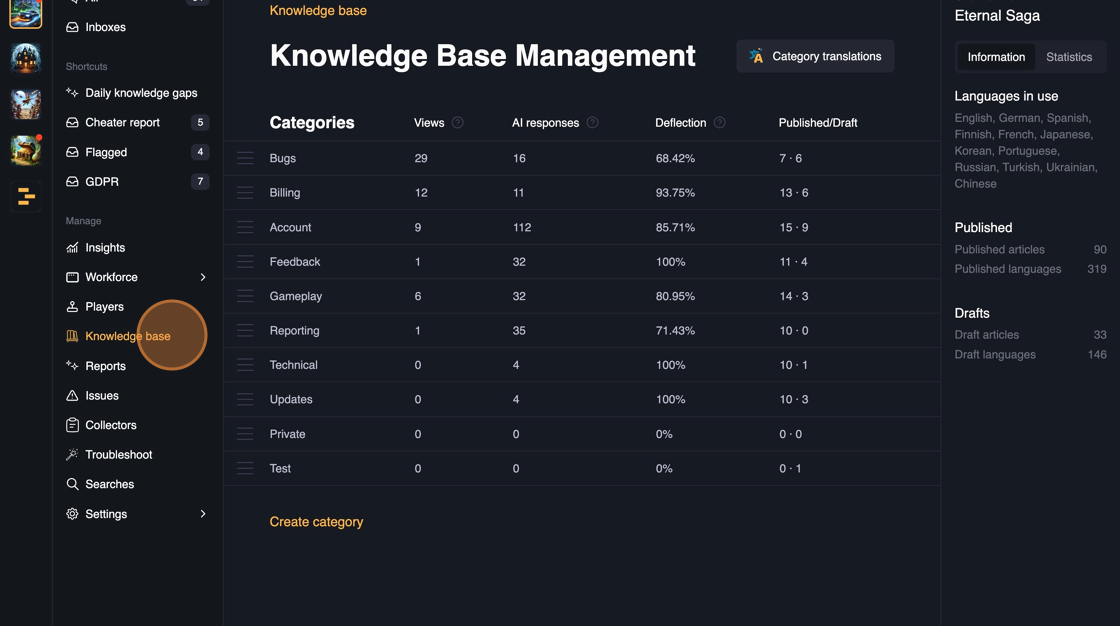 Whenever a new content is published in the Knowledge base, the answers are immediately available in all of the channels: Web, In-game SDK, Discord.
