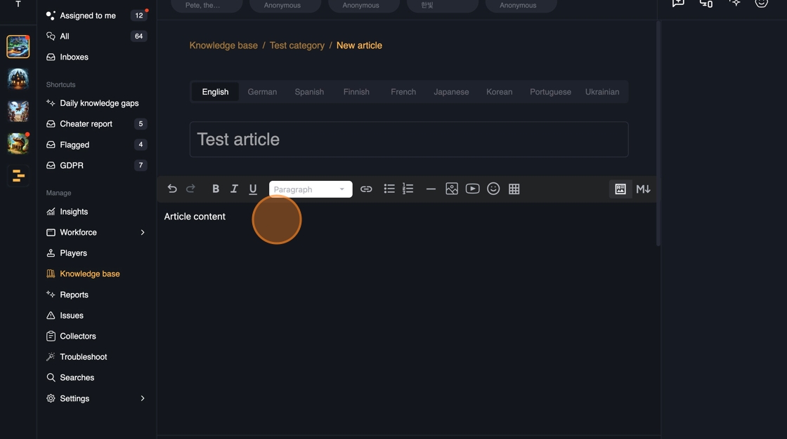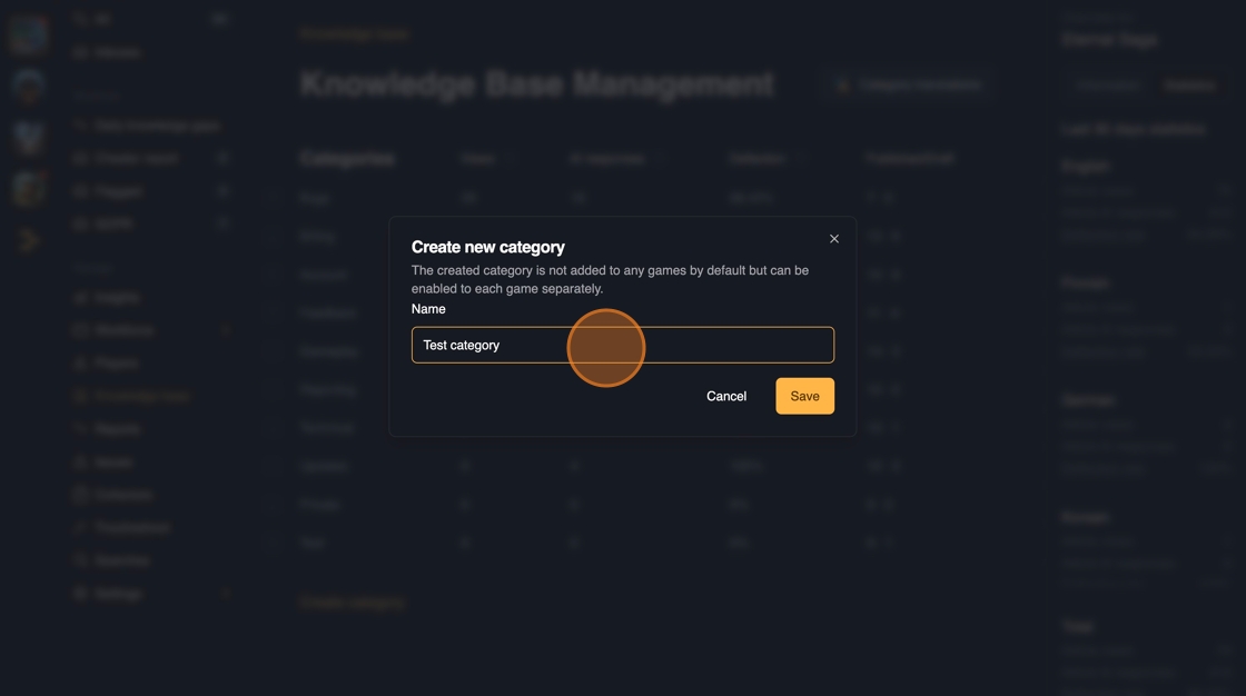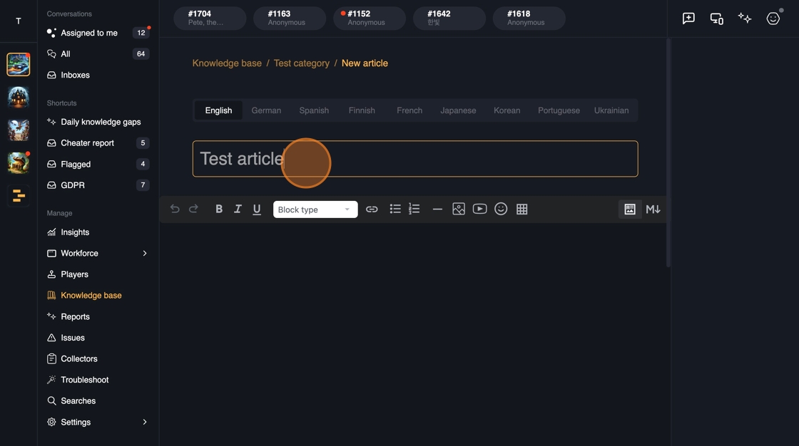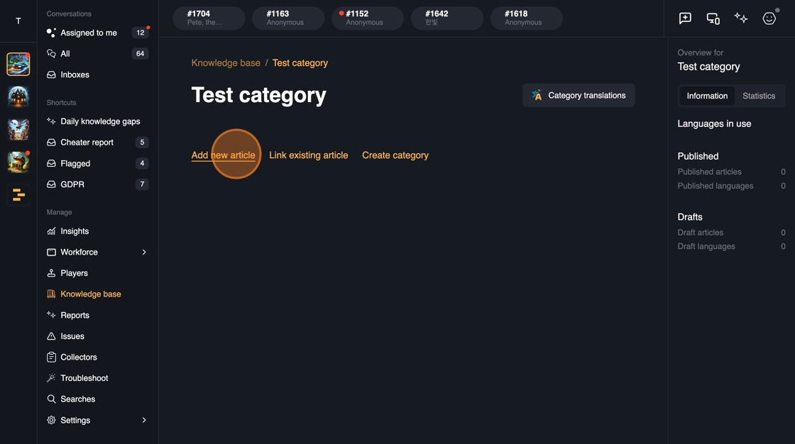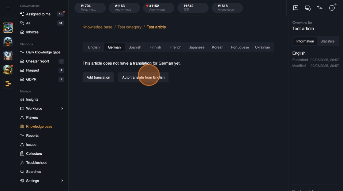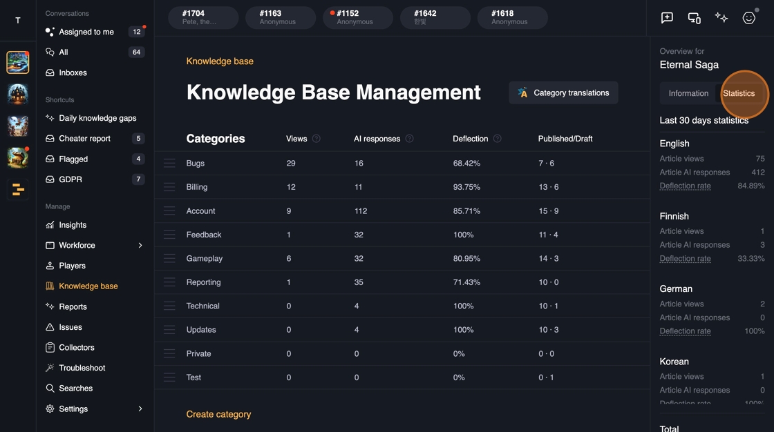 Whenever a new content is published in the Knowledge base, the answers are immediately available in all of the channels: Web, In-game SDK, Discord.