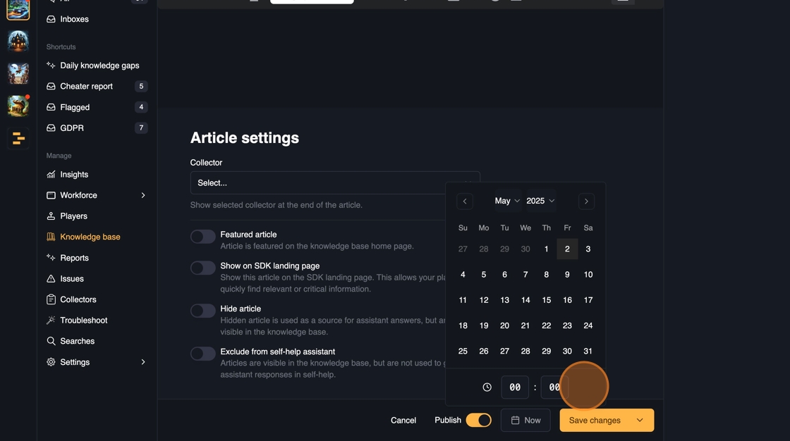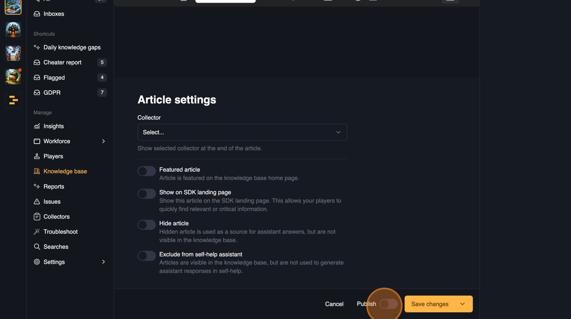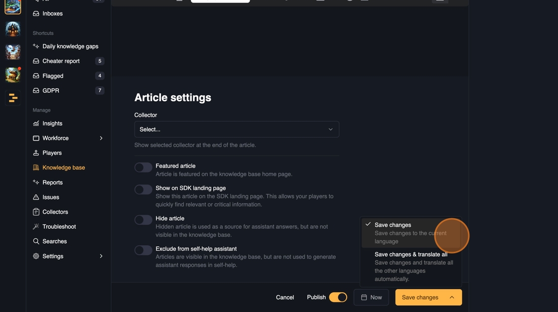 - Show on SDK landing page: This will make the article immediately available to the players when they open the in-game SDK