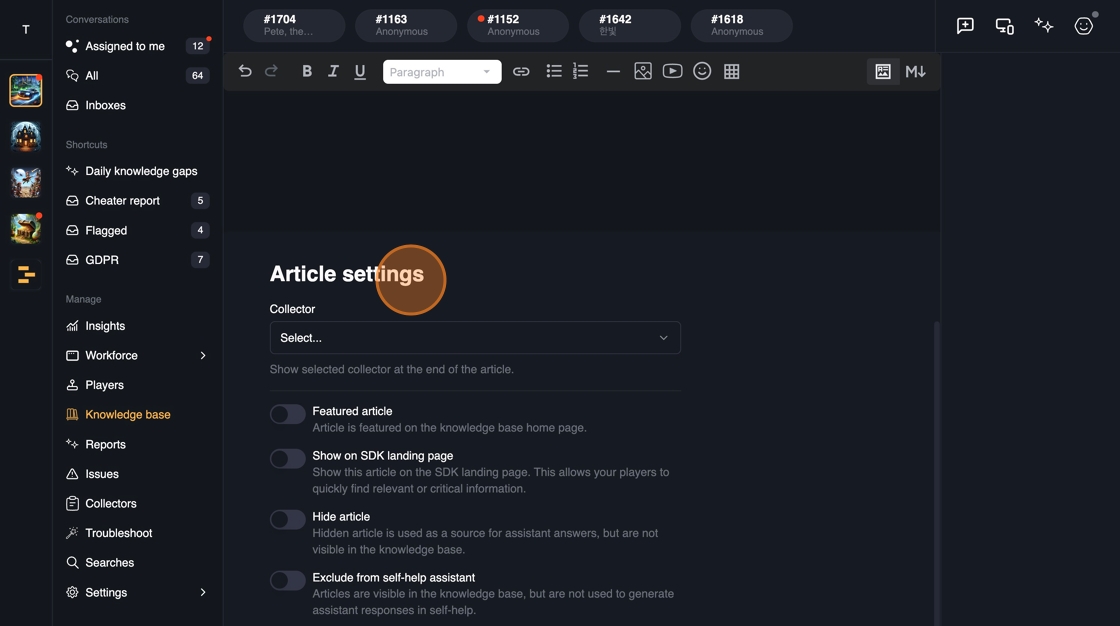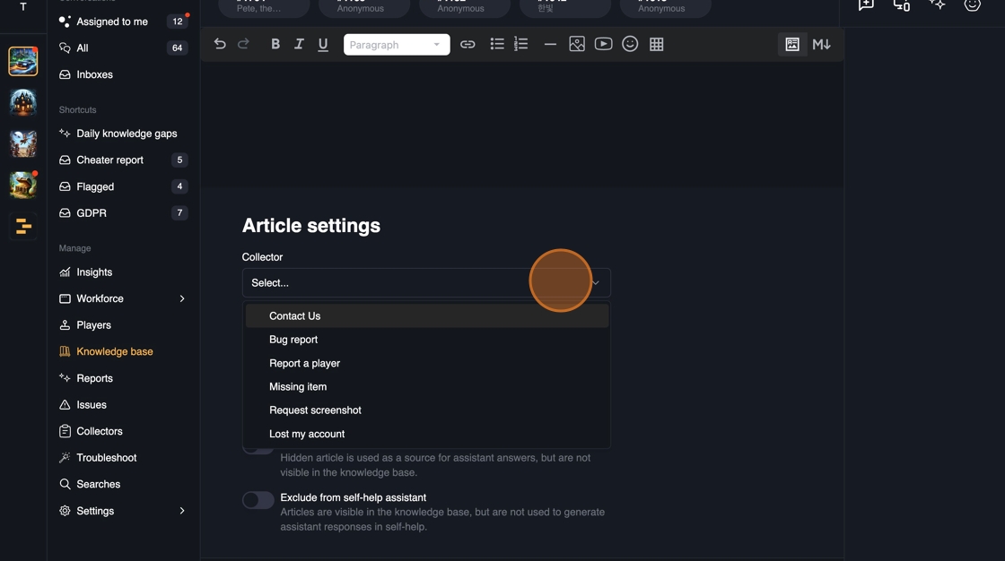 - Exclude from self-help assistant: AI will not be able to utilize the content to give responses to the players, but the article is visible.
