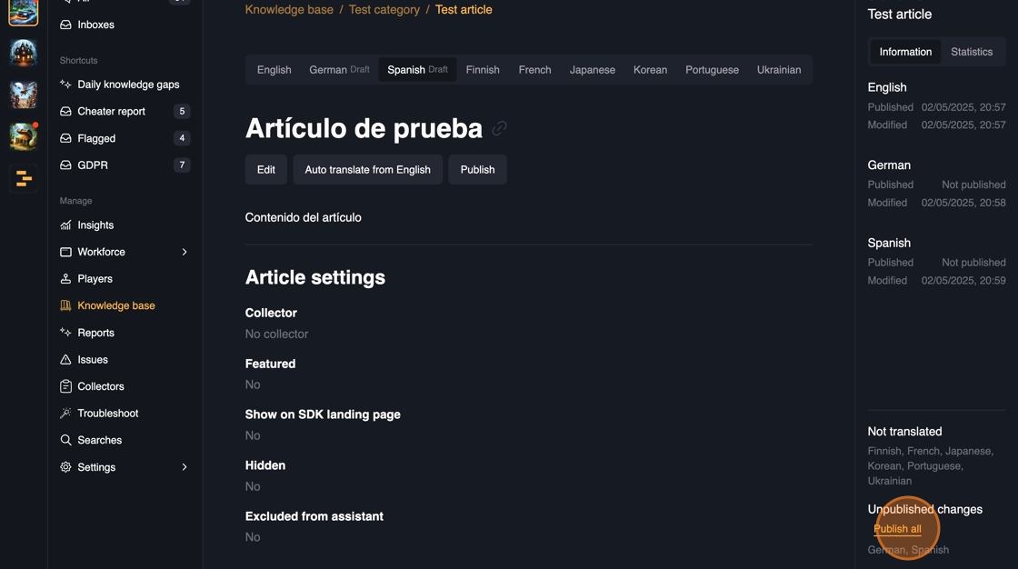 19. If you have multiple drafts across different languages, it's possible to press 'Publish all'. This way you don't have to go through publishing individual translations.