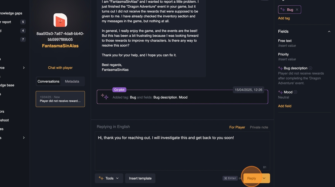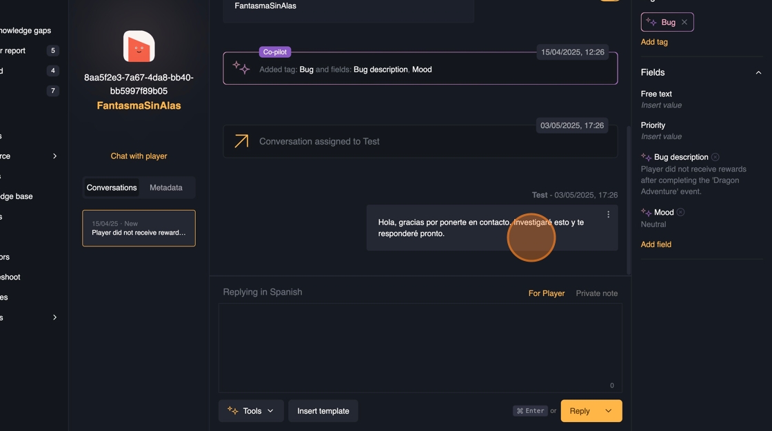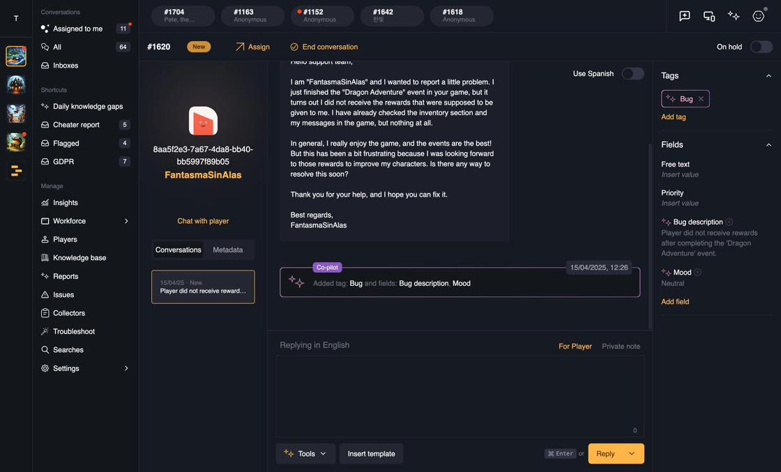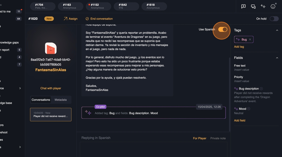 Theymes supports multilingual tickets by automatically translating the player messages to English.