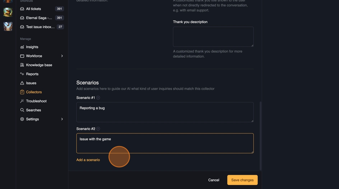 You can also add scenarios to collectors. Our assistant uses these scenarios to suggest relevant collectors to users based on a smart intent matching to deliver the best results. You can add as many scenarios as you like, and we recommend reading the Scenarios Best Practices article to get the most out of them.