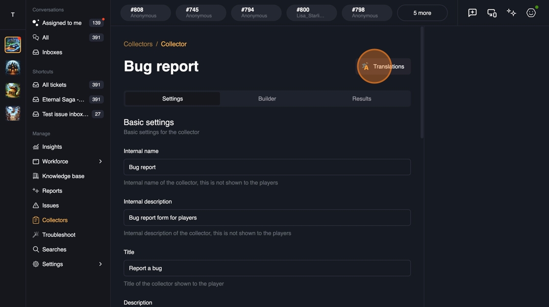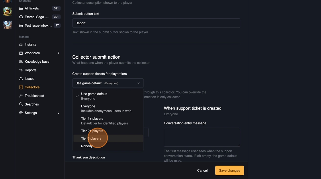 You can configure the collector to use the game default of who can contact support or override the default if needed. For example, you might not want to enable support for anonymous players except for a special lost account collector. Or you might want to collect information for most users but take your VIP users to support for better service.