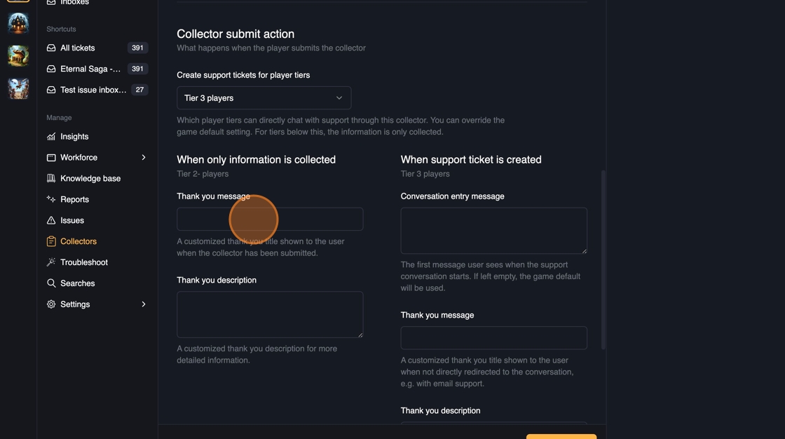 You can also configure what to show to the users once they are taken to support or when they see the thank you page. Game defaults are used if not specified.