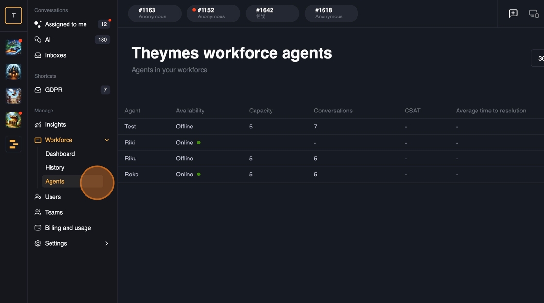 6. From the Workforce > Agents view you can see real-time agent availability along with capacity set and assigned tickets.